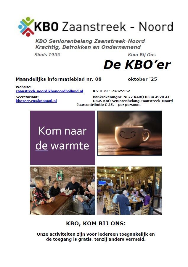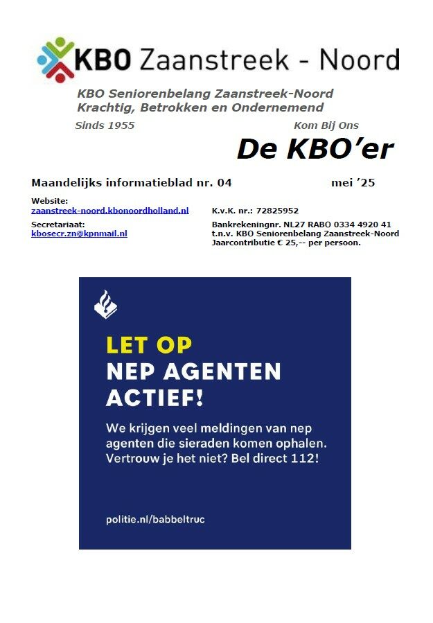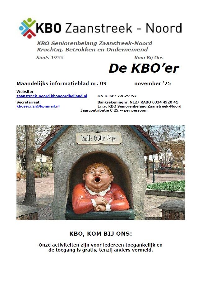 U bevindt zich op de Nieuwsbrief pagina van KBO Seniorenbelang Zaanstreek Noord. Hier kunt u een Nieuwsbrief openen door op een afbeelding van een Nieuwsbrief te klikken. Dan leest u de Nieuwsbrief on-line. Een praktisch voordeel hiervan is dat verwijzigingen (linken) naar pagina’s op onze website maar ook verwijzigingen naar andere websites en/of e-mail adressen actief zijn. Door op zo’n verwijzing te klikken gaat u automatisch naar een andere pagina, website of start uw e-mail programma om een e-mail te versturen.